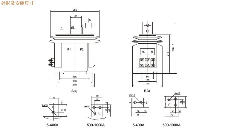 本型互感器一次繞組及二次繞組用環(huán)氧樹(shù)脂澆注成型,鐵心用夾件裝在絕緣注體上,夾件上有名牌,夾件的底腳有四個(gè)安裝孔。